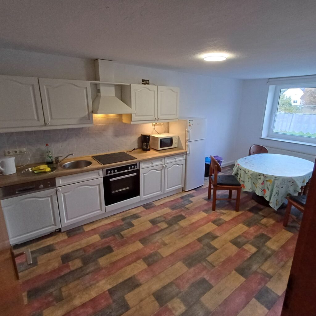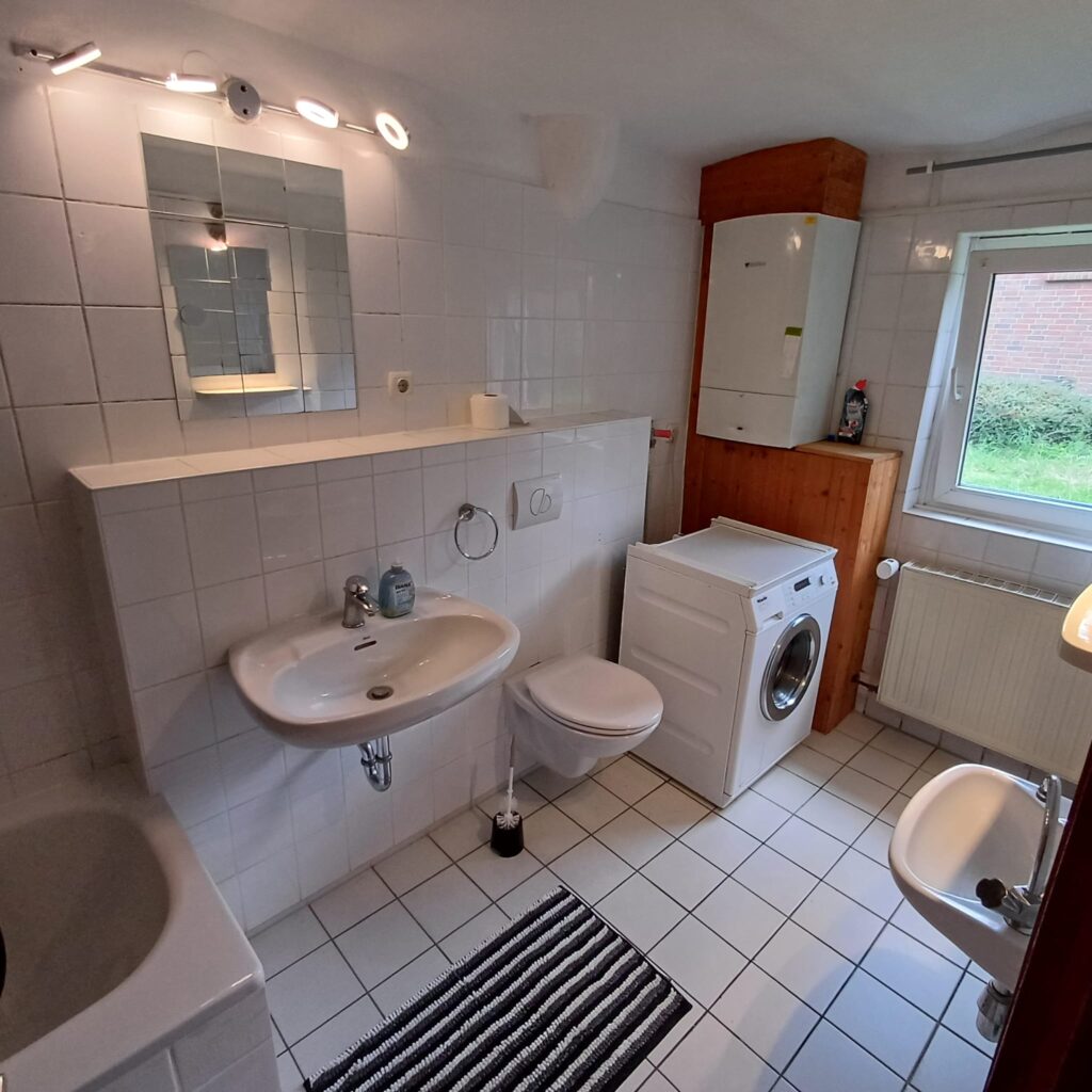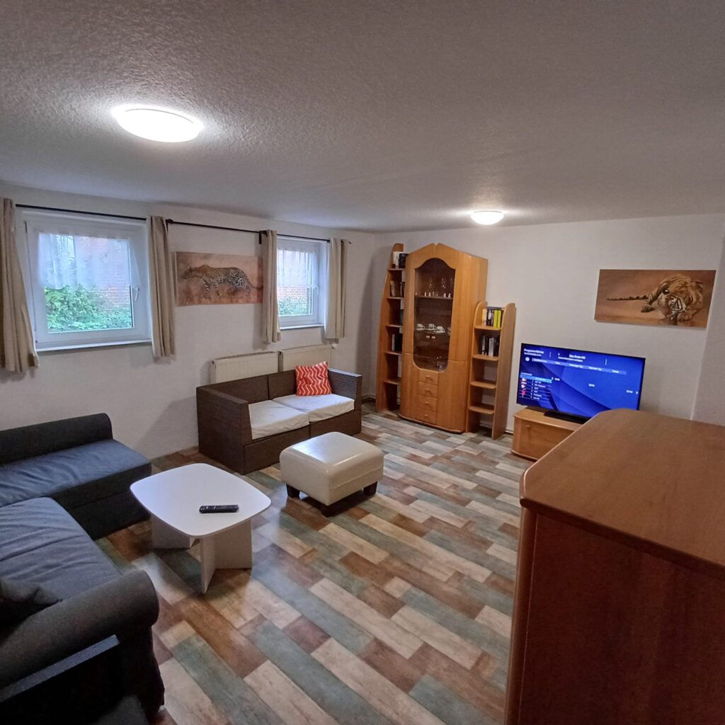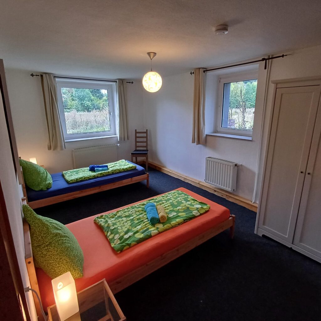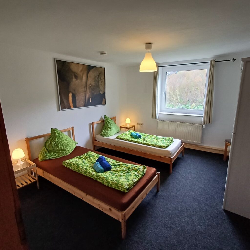 Die Wohnung Moschusochse im Parterre verfügt über ein Bad mit Dusche, Badewanne und Waschmaschine, sowie zwei Schlafzimmer, ein Wohnzimmer und eine Wohnküche. Der Blick geht in den Garten und die Hönnewiese.